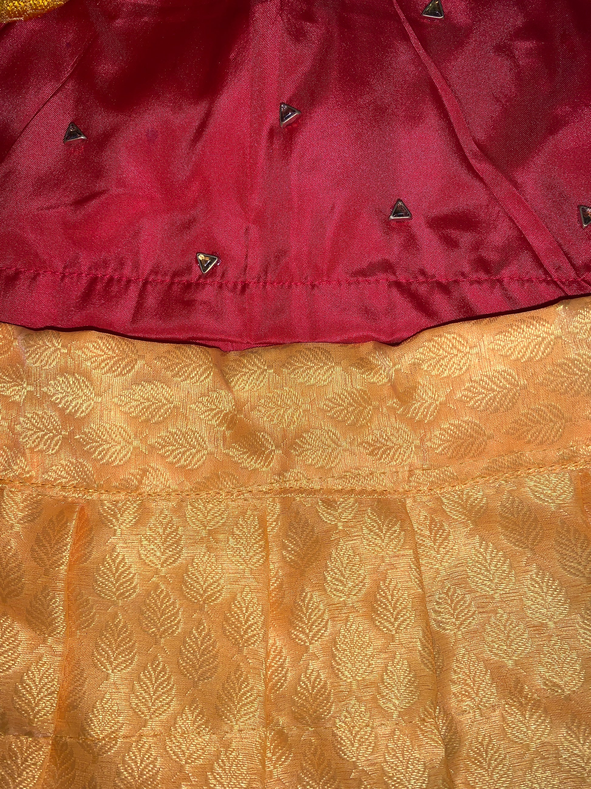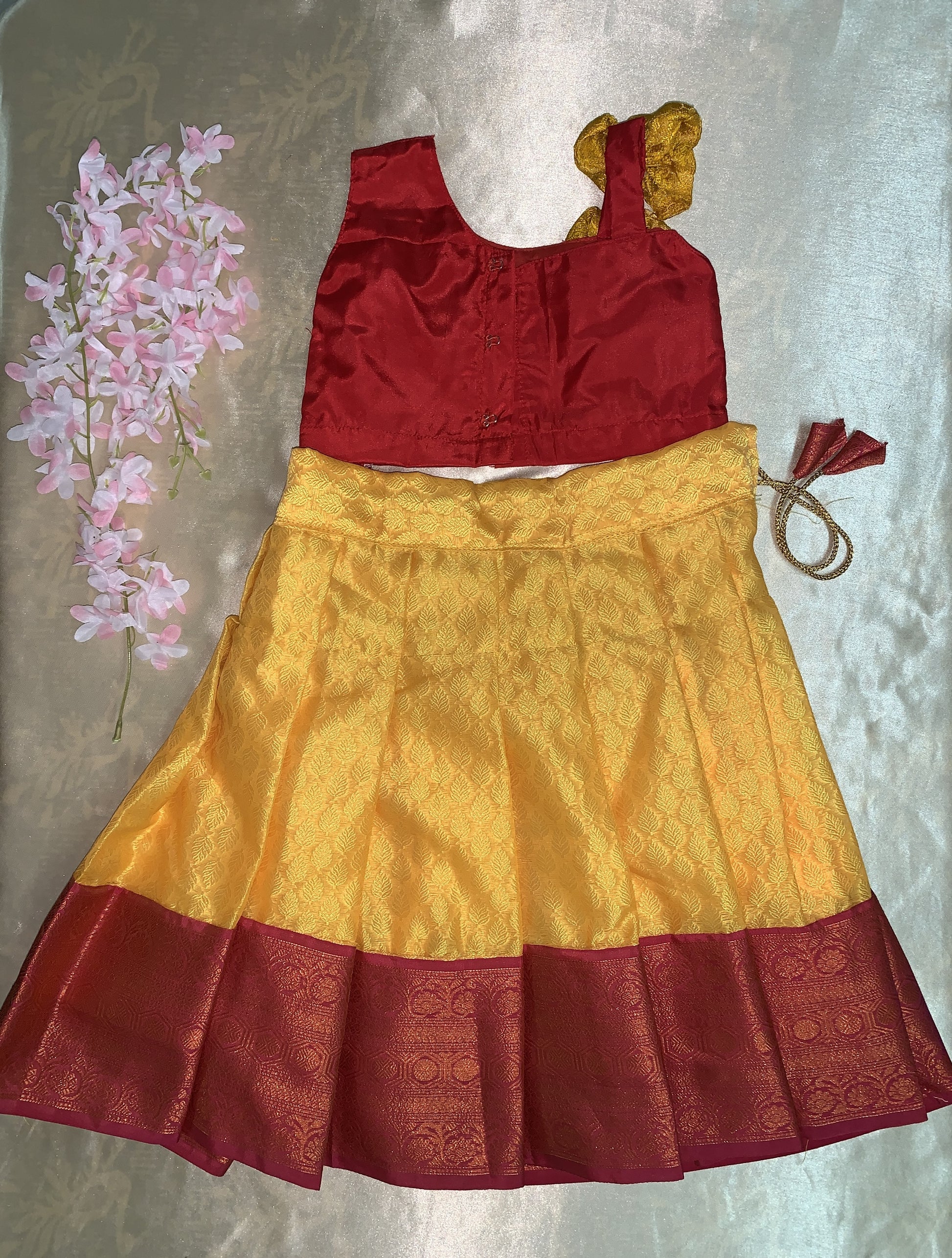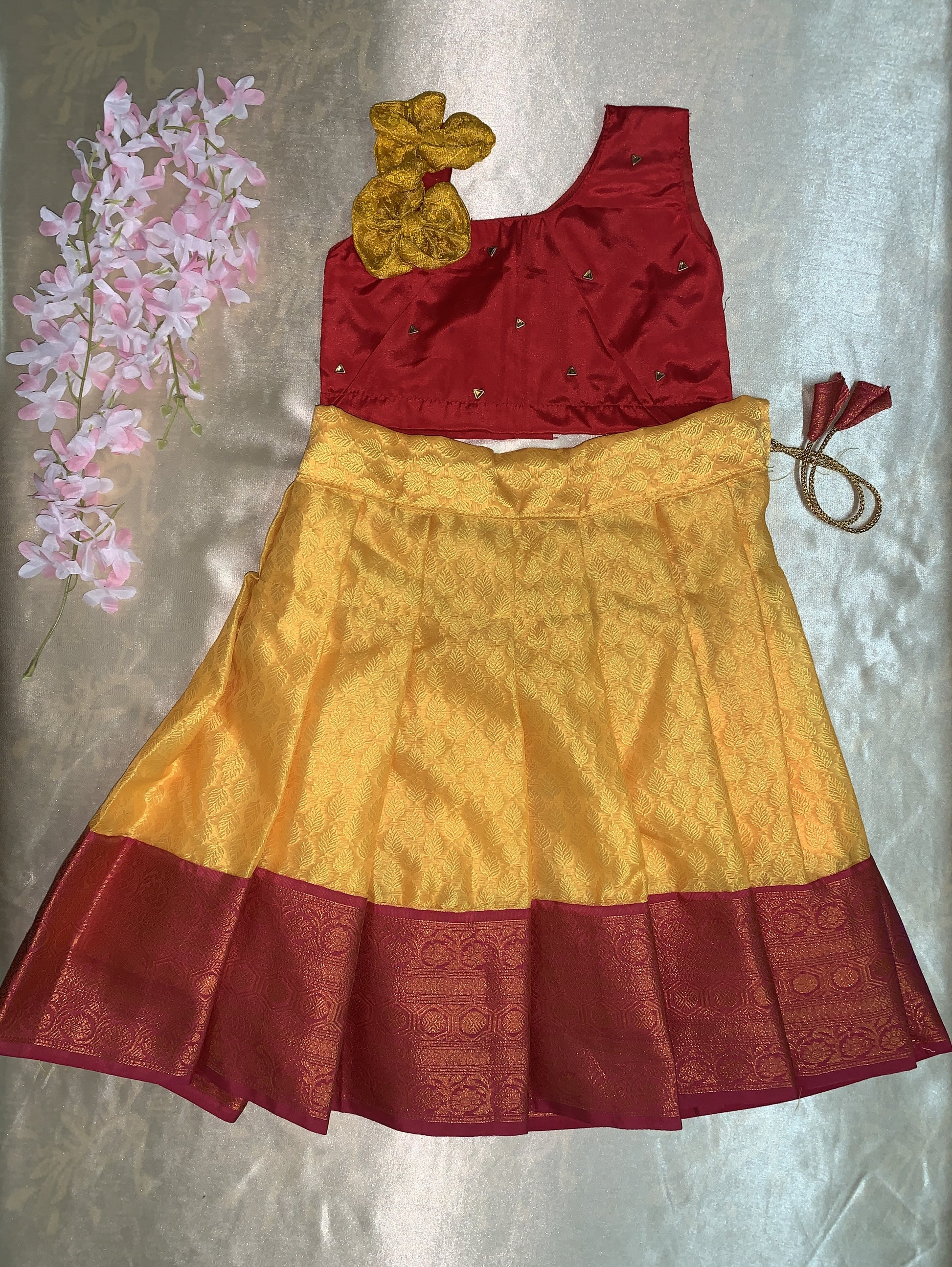 Experience the comfort and elegance of Pattu Paavadai, making it a must-have for any special occasion. This can also be styled as crop top, Fashion with a modern twist. Our products are made with quality materials and traditional designs, this Pattu Paavadai is sure to be a staple in your kids wardrobe.
